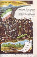 این تصویر که به رغم جدی بودن محتوای آن اندکی کاریکاتوری است، قیام مشروطیت را مصور کرده و تمام اصول مصور سازی در آن رعایت شده است. از آسمان ایران گرفته تا خورشید که پشت کوه دماوند طلوع کرده  و امواج جمعیت و رهبران و شهدای قیام در جلو و باغ سفارت روس درمندرج یا اینست  همه در جای مناسب خود نقش شده و ورقۀ استعفای محمد علی شاه آن را کامل کرده است.