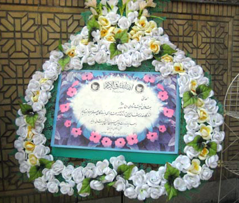 مسیر پیاده روی منتهی به در ورودی، جائی که سوکواران شرکت کننده در ختم از آنجا داخل می شدند، از هر دو طرف، ردیف و پشت سرهم، از تاج گل های مصنوعی عجیب وغریب، با رنگ های تند وغیرعادی پوشیده شده بود. انگار برای رسیدن به مسجد باید از یک تونل گل مصنوعی رد می شدیم.