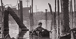 هنرمند دیگری که با عکسهای مستندش در این نمایشگاه حضور دارد جاسم غضبان پور عکاس خوزستانی است که در تمام سالهای جنگ دوربین به دست به ثبت لحظهها پرداخته است، لحظههایی که روایتی متفاوت از جنگ دارند. با اینکه این مجموعه در حد فاصل عملیات بیتالمقدس و اوج جنگ عکاسی شده اما این بار خبری از خاکریزها و سلاحها و کشتههای جنگ نیست، او اسباب بازیهای سوخته در انبارهای گمرگ بندر خرمشهر، سینمایی که حالا جز پرده و صندلیهای سوخته و خاطراتش چیزی ندارد، کودکی که در قایق کوچکش در شط و در میان نخلهای سوخته سرش را گرم میکند، مبلی که بیصاحب در خیابان رها شده و درختهایی که بیخیال هرس شدن به وسط خیابان پیشروی میکنند، دوچرخۀ سوختهای که دیگر رکابهایش نمیگردد تا لذت دوچرخهسواری را به کودکی هدیه کند را به ثبت میرساند.