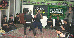و گه گاه مردمی را با پاهای برهنه و ردای سیاه بلند بر تن می بینید که در یک صف طولانی زنجیر می زنند، همراه با نوحه ای به زبان عربی: انا مظلوم حسین/ انا عطشان و قد احرق نطقی و لسانی/ انا ظمئان و قد احرق قلبی و فوادی/ انا مظلوم حسین (من حسین مظلوم هستم/ من تشنه هستم و لب و دهانم خشک شده است/ من بسیار تشنه ام و دل و جگرم سوخته است/ من حسین مظلوم هستم.)