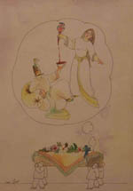 گامی بلند برداشتيد در ميان سالی با اين کارها و با فرش – نگاره های پيشين و به باشگاه طنز پردازان جدی خوش آمديد. خوشا که توانسته ايد مضحکه ای از مرگ – بازی را سرخوشانه به ما نشان دهيد. به مستبد بزرگی که مرگ نام گرفته خنديده ايد و ما را هم می خندانيد. اين کار را با قلمی ظريف و چالاک، با ترکيب بندی استوار، با بهره گيری از نگارگری بومی ( بويژه قلم گيری مينياتوری ) صورت داده ايد. طراحی فضای موحش اما شاد، جرأتی جوانانه می خواهد و سبکساری. دل مرده ها، حتا دلمرده ها، را شاد کرده ايد.