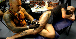 یکی از تاتوکارها مرد میان سالی از اوکلند نیوزیلند است، سر و بدنش تقریبا پوشیده از طرح های مختلف خالکوبی است.