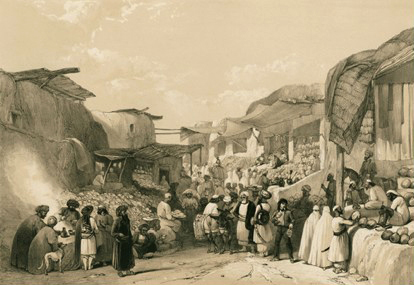 اين دوره اکنون معروف به دوره "جنگ نخست افغان" است. اما همه طرح ها و نقاشی های آتکين سن در باره رزمندگان و نبرد ها نبود. وی، به مانند بسياری ديگر از مسافران بريتانيايی در افغانستان، "شيفته ظاهر مجلل دکه های ميوه فروشی سرشار از هندوانه و گلابی و سيب و آلو و هلو" بود. او در اين تابلو خيابان اصلی مشرف به بازار کابل در موسم ميوه را تصوير می کند. به آن پسرک کاملا غير افغان در منظره جلو تابلو توجه کنيد که شلوارهايی به شيوه بريتانيايی به تن دارد.