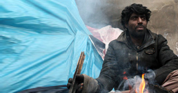 مرد سیهچرده برای گرم شدن لباس میسوزاند. زنی دیگر هیچ نشانی اززنانگی ندارد، خمار در میان گـِل ولای نشسته است. دو دختر در زیر این باران و بر روی زمین سرد پتویی روی سرشان کشیدهاند و خوابیدهاند و با تکههایی از پلاستیک حالت چادر را به زاویه دیوار داده اند.
