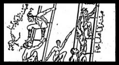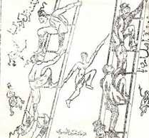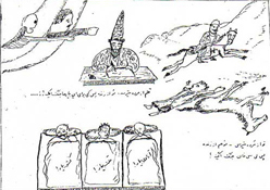 این تصویر، که از شمارۀ 8 روزنامۀ جنگل مولا، چاپ تهران، گرفته شده  نمونه ای است از آنچه که به نام کاریکاتور در مطبوعات دورۀ مشروطیت به خوانندگان روزنامه  ها عرضه می شده است. در این به اصطلاح کاریکاتور، هیچ روشن نیست میرزائی که با قلم و دواتش در  وسط تصویر نشسته مشغول نوشتن چه چیزی است. یا آن خان بختیاری که در کوهستان ها به تاخت و تاز مشغول است با میرزا و  سواری که خودش واسبش نقش زمین شده اند، و  آن سه بیماری که بر روی تخت های عمودی خوابیده اند، و  مرده و زنده ای که از گوشۀ چپ تصویر به سوی میرزا مشت حواله کرده اند، چه رابطه ای با او دارند.