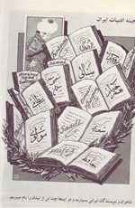ترکیب بسیار هنرمندانه ای است که تالبرگ از مجموعۀ کتاب های ادبیات فارسی ساخته است. برای اشاره به هنر ایران یک فیگور مینیاتوری در بالا و برای ستایش از هنر و ادب ایران یک حلقۀ برگ زیتون به دور مجموعۀ کار کشیده است.