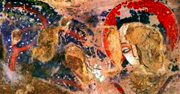 روی ديوار غار های باميان بوزينه های رنگين قوزکرده کنار مردهايی که روبروی هم ايستاده اند، می دوند و برگ های نخل با ظرافت با موجودات افسانه ای در هم پيچيده اند.