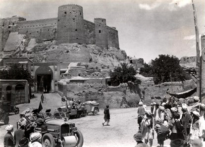 اين عکس خودروهای نظامی با يدک های دوچرخه را در محوطه "بالا حصار" هرات در سال ١٩٣٣ نشان می دهد. آب و رنگ عکس واقعا امروزی است: در کنار حصار قديمی می توان ماشين ها و خطوط تلگراف يا تلفن را هم ديد.